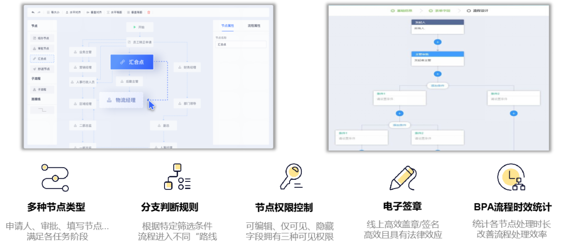 零代码流程引擎,为业务高效流转提供坚实的技术支持。可视化的流程设计界面,易上手、够强大,无需代码即可轻松创建、改变、维护业务流程应用